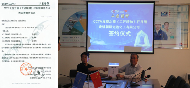 我公司提交的CCTV發(fā)現(xiàn)之旅《工匠精神》資料通過審核,5月11日收到CCTV發(fā)現(xiàn)之旅終審告知函,欄目組于5月17日來我公司進(jìn)行實(shí)地考察并舉行了簽約儀式!