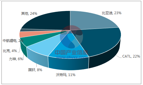 2015 年中國電動汽車用鋰離子動力電池呈現中集中寡占型市場,與下游新能源汽車市場較為集中有關: