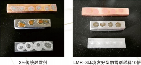 3、防腐蝕性能好,采用M3超膜防銹技術,對碳鋼、銅、鋁合金等金屬幾乎不腐蝕;對瀝青、混凝土路面腐蝕小。LMR-3融雪劑防銹性能見下圖。